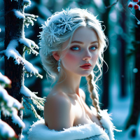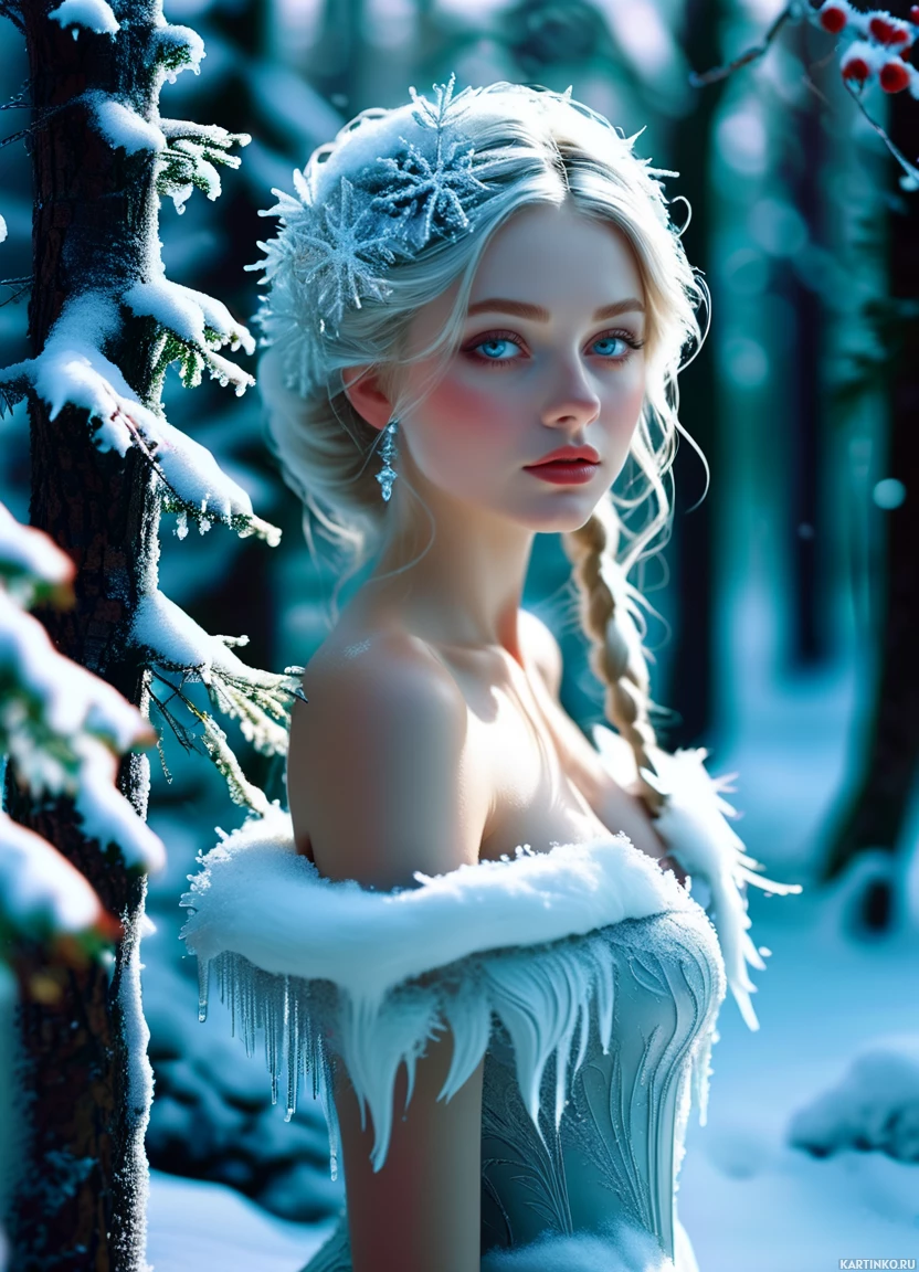 blue eyes and is wearing an ornate, ice-themed costume that suggests she may be Elsa from the popular animated film "Frozen." The character is standing amidst a snowy