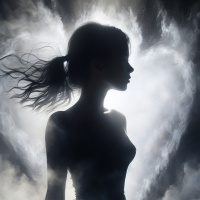 На картинке силуэт девушки, смотрящей вправо. У нее длинные волосы и платье с открытой линией декольте. За ней – большое сердцевидное узору, похожее на источник света или энергии. Над сердцем – полная луна, а на темном фоне – облака и звезды. Общая атмосфера картинки создает ощущение мистической или потусторонней обстановки.