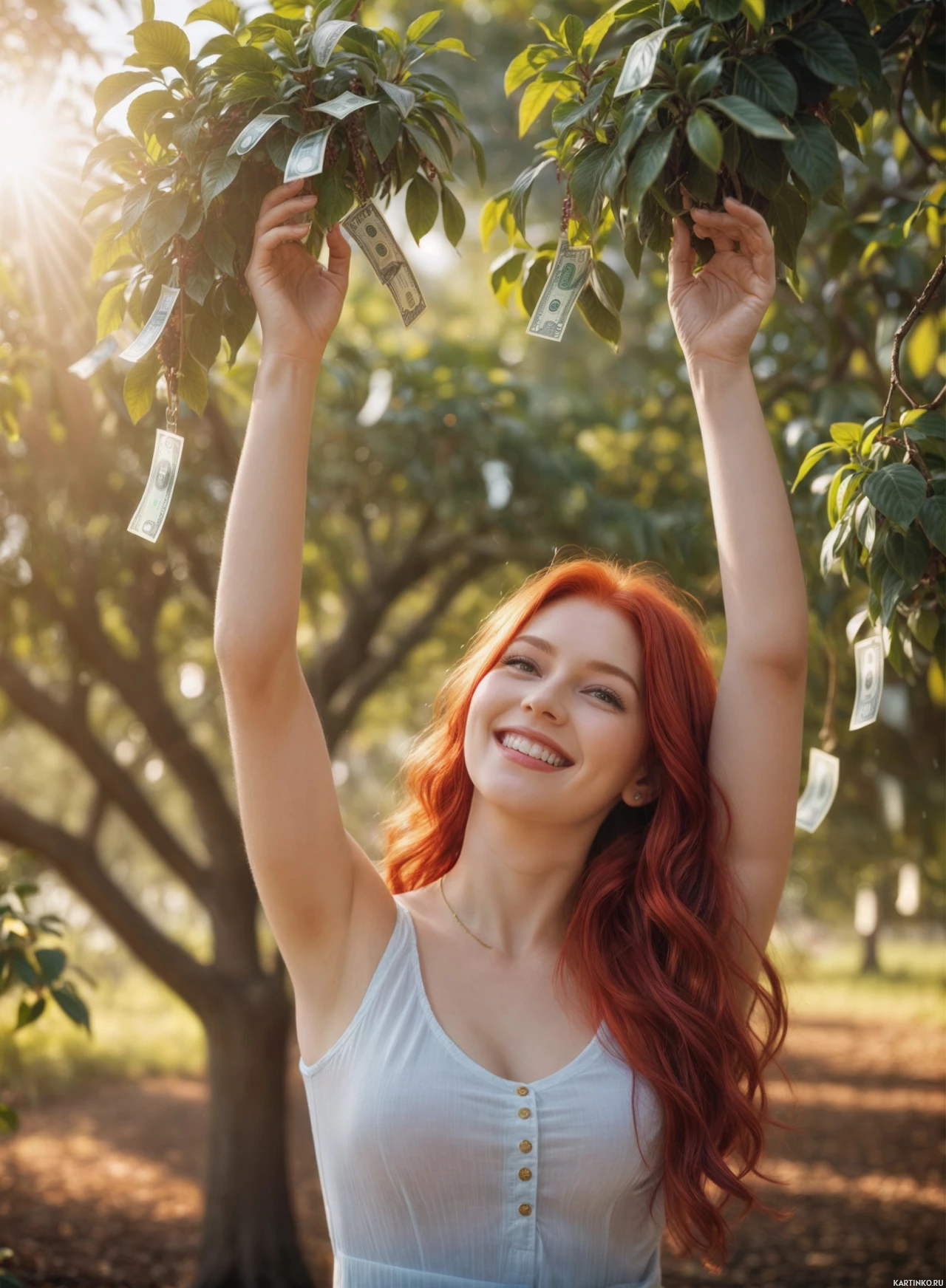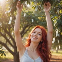 red hair who is smiling as she reaches up towards the camera. She appears to be holding something in her hands that looks like