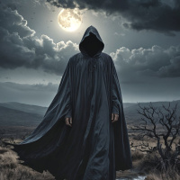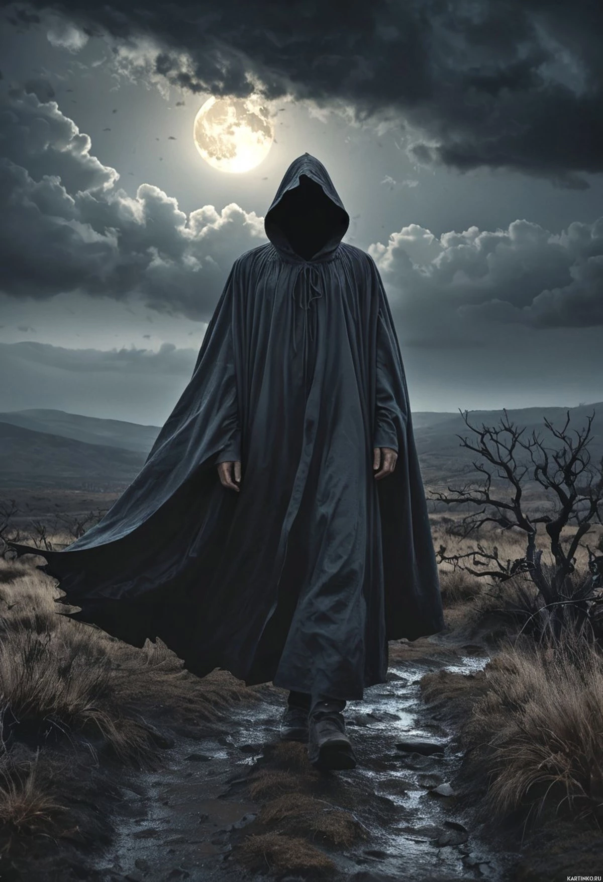 На картинке запечатлён силуэт, идущий навстречу камере по каменистой, безжизненной местности ночью. На человеке длинный тёмный плащ с капюшоном, скрывающий лицо, руки скрещены на груди. На небе – полная, яркая луна. Над головой нависли тёмные тучи, предвещающие надвигающуюся бурю или, возможно, её последствия. На заднем плане – суровый ландшафт с редкой растительностью и скальными образованиями, напоминающими окаменевшую древесину из-за их причудливой формы.