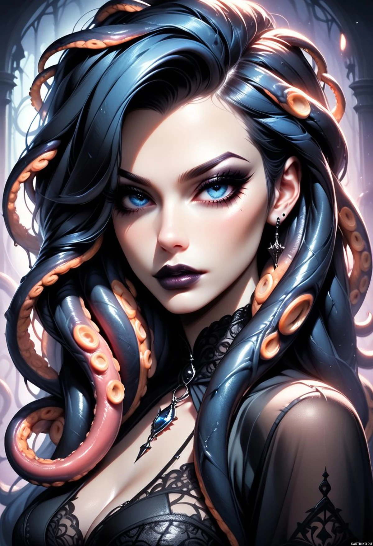 Персонаж с волосами, как у осьминога, в мрачной фэнтезийной обстановке Картинки с такими же тегами