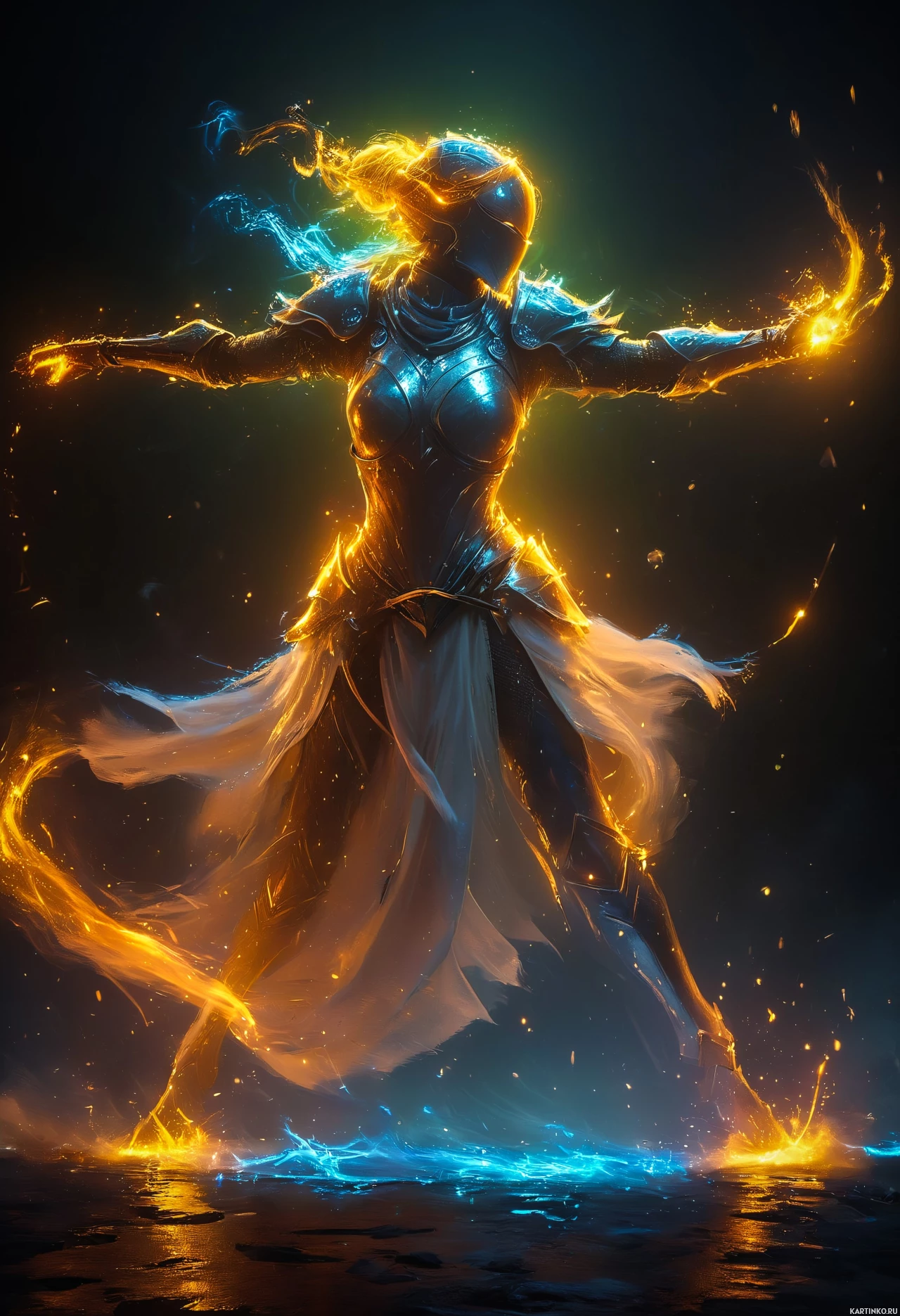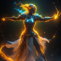 magical energy emanating from them. Her attire includes armor that suggests