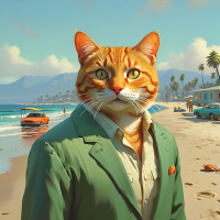 На картинке изображен трехмерный персонаж – антропоморфный кот, стоящий на пляже. У кота преимущественно оранжевая шерсть с более темными отметинами, особенно вокруг мордочки и ушей. На нем надет зеленый пиджак поверх бежевой рубашки, а также серый жилет с текстурой, напоминающей твид. Под жилетом видно карман, из которого выглядывает носовой платок. Кот стоит прямо и смотрит на зрителя с внимательным выражением. На заднем плане – чистое голубое небо и пальмы, указывающие на тропический пейзаж. Там же видны фигуры вдали, которые, похоже, люди, но они не являются основным фокусом картинки. Общий стиль картинки наводит на мысль о видеоигре или мультфильме, учитывая уровень детализации и реалистичность персонажей.