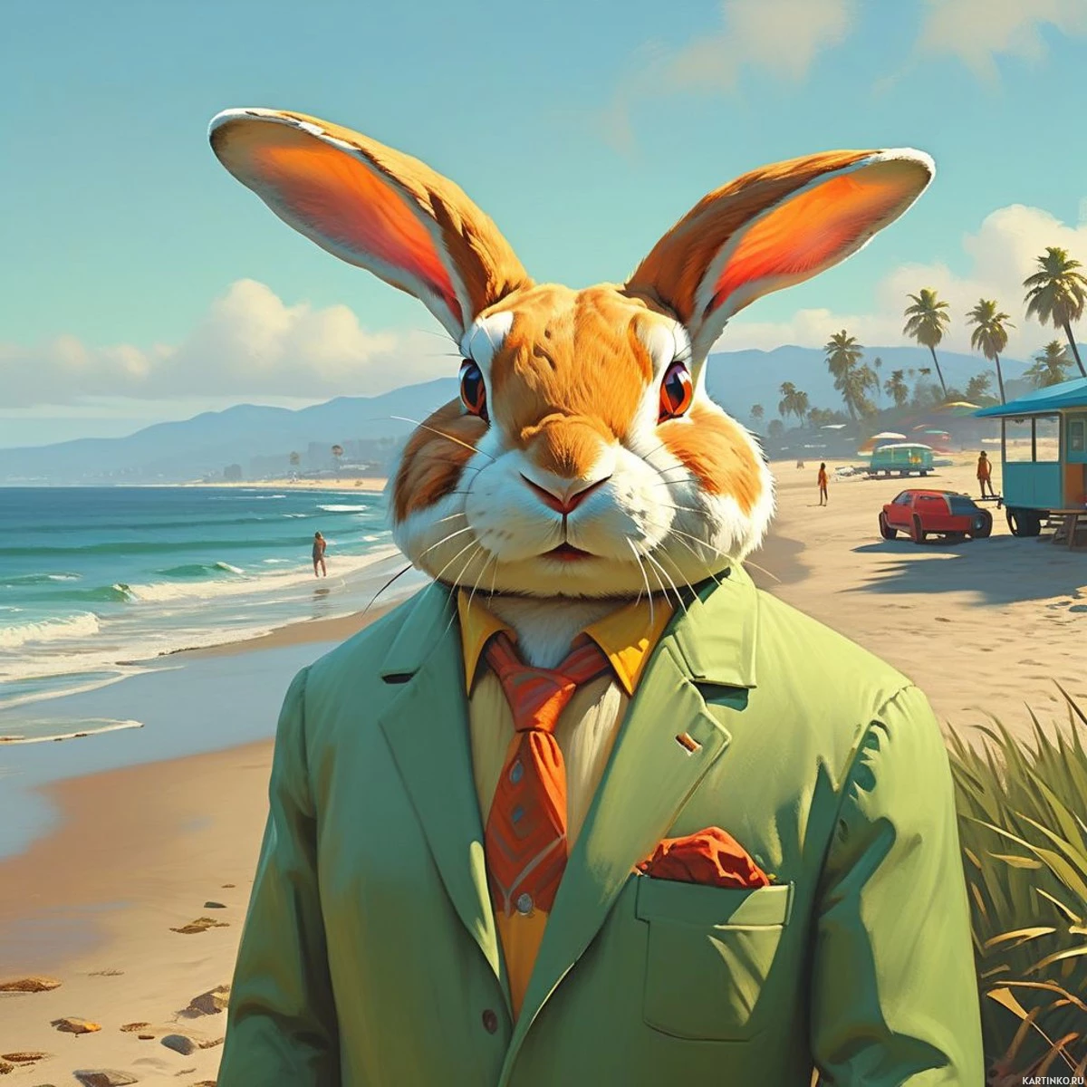 На картинке изображен человек в огромной заячьей маске с большими ушами, стоящий на пляже. Судя по пальмам и океаном, это пляж в Калифорнии. На заднем плане – автобусная остановка и люди, занимающиеся обычными пляжными развлечениями: загорают и гуляют вдоль берега. Человек в заячьей маске одет во фрачный костюм: пиджак, галстук и платок в кармане.