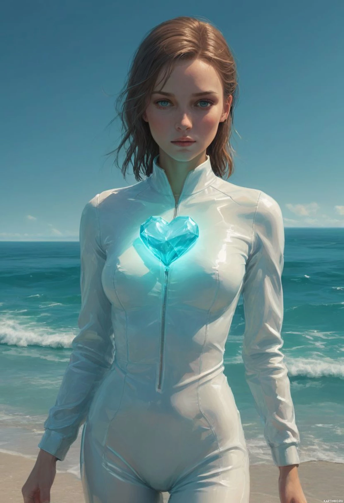 На картинке женщина стоит на пляже в ясный день. На ней облегающий серебристый комбинезон с сердечком на груди. Комбинезон плотно прилегает к фигуре и блестит, отражая свет. У неё длинные волнистые волосы, свободно ниспадающие на плечи. У неё светлая кожа и темные глаза, выражение лица нейтральное. На заднем плане видны песчаный пляж и вода, где можно заметить небольшие волны.