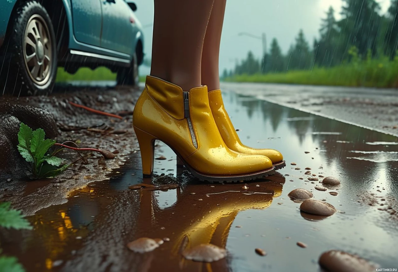 На картинке стоит пара жёлтых резиновых сапог на земле рядом с дорогой. Водице отражаются их яркий цвет. На заднем плане виден частично автомобиль, дизайн которого намекает на более раннюю эпоху. Рядом с сапогами стоит человек в такой же жёлтой обуви. Он выглядит так, будто смотрит не в камеру, а вдоль дороги. Похоже, что действие происходит во время или после дождя, судя по мокрой дороге и отражениям в лужах.