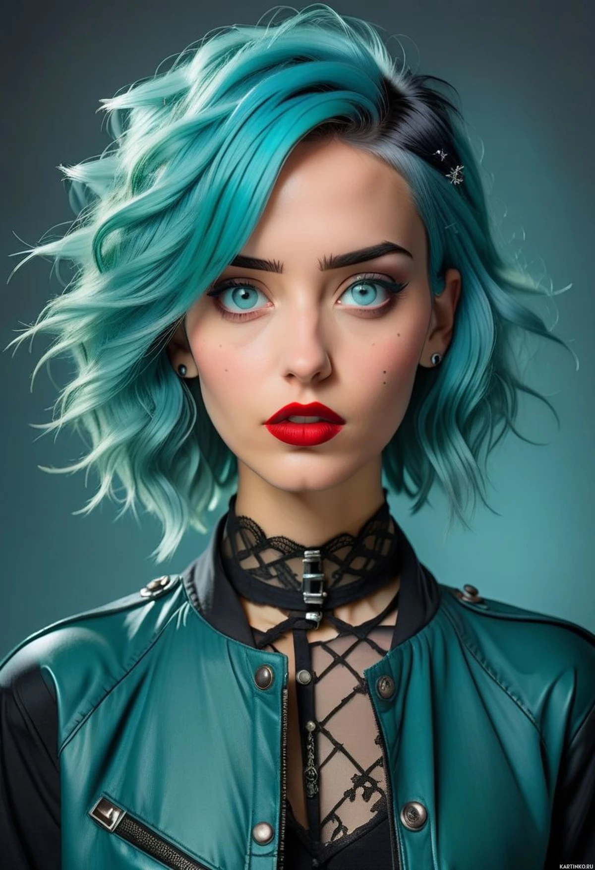 На картинке — человек с бирюзовыми волосами, уложенными в дерзкой, современной прическе с челкой и боковыми прядями. У них ярко-красные губы, контрастирующие с бледной кожей. Их взгляд направлен прямо в камеру, выражая уверенность или напряженность. На них черная кожаная куртка с видимыми молниями и кружевной отделкой на воротнике. Над правым брови, чуть выше, заметен небольшой аксессуар. Фон нейтральный, что полностью фокусирует внимание на лице и верхней части тела.
