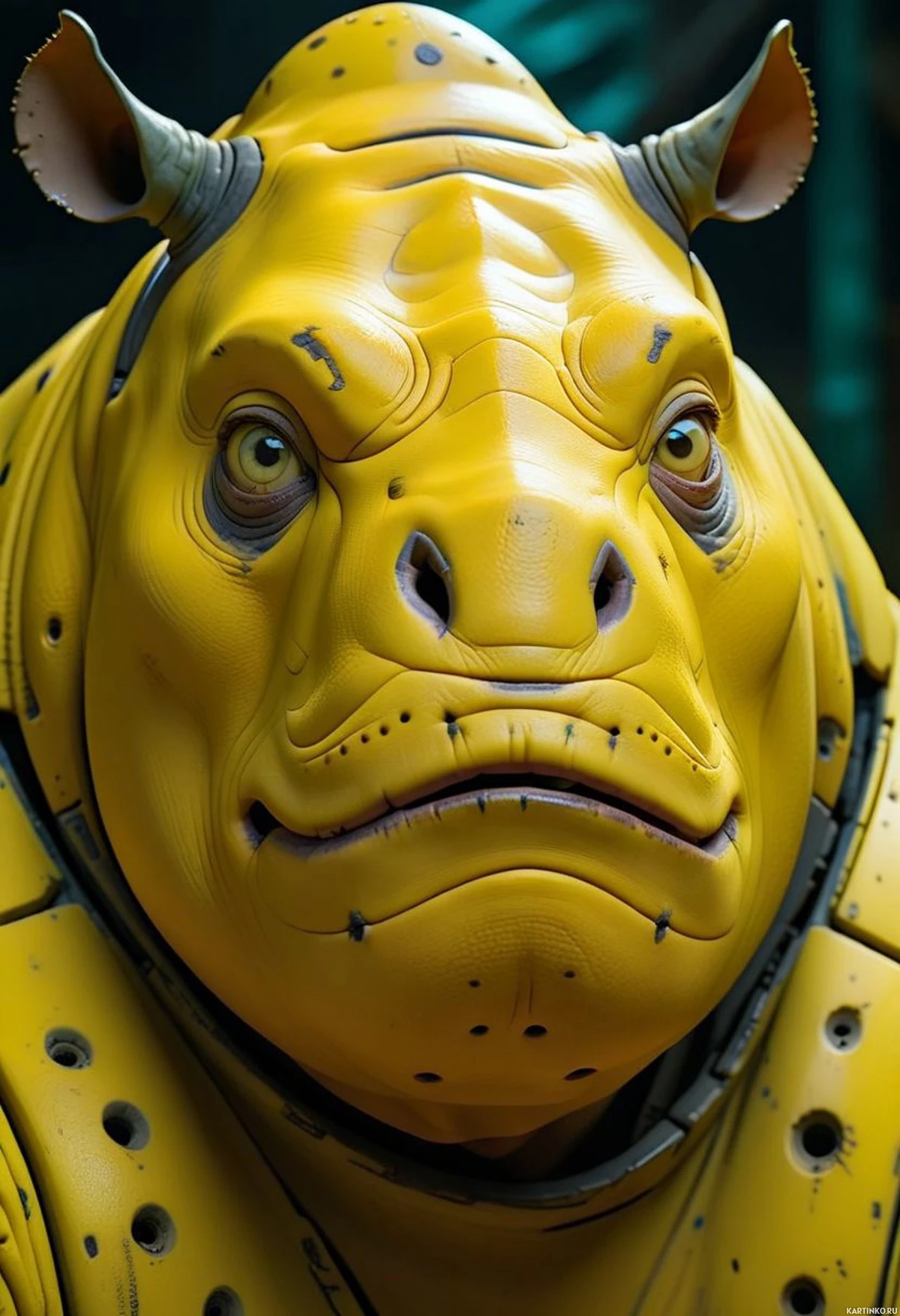 На картинке изображен персонаж с ярко-желтой кожей и большими белыми ушами, похожими на собачьи, одетый в то, что выглядит как скафандр. Лицо персонажа проработано в деталях: взгляд направлен вперед, губы слегка приоткрыты в строгом или напряженном выражении, брови приподняты, что придает ему внушительный вид. На костюме видны лямки на плечах и панель на груди, намекающие на механические соединения или элементы управления. Фон темный и размытый, что предполагает обстановку, возможно, связанную с космическими исследованиями или боем.