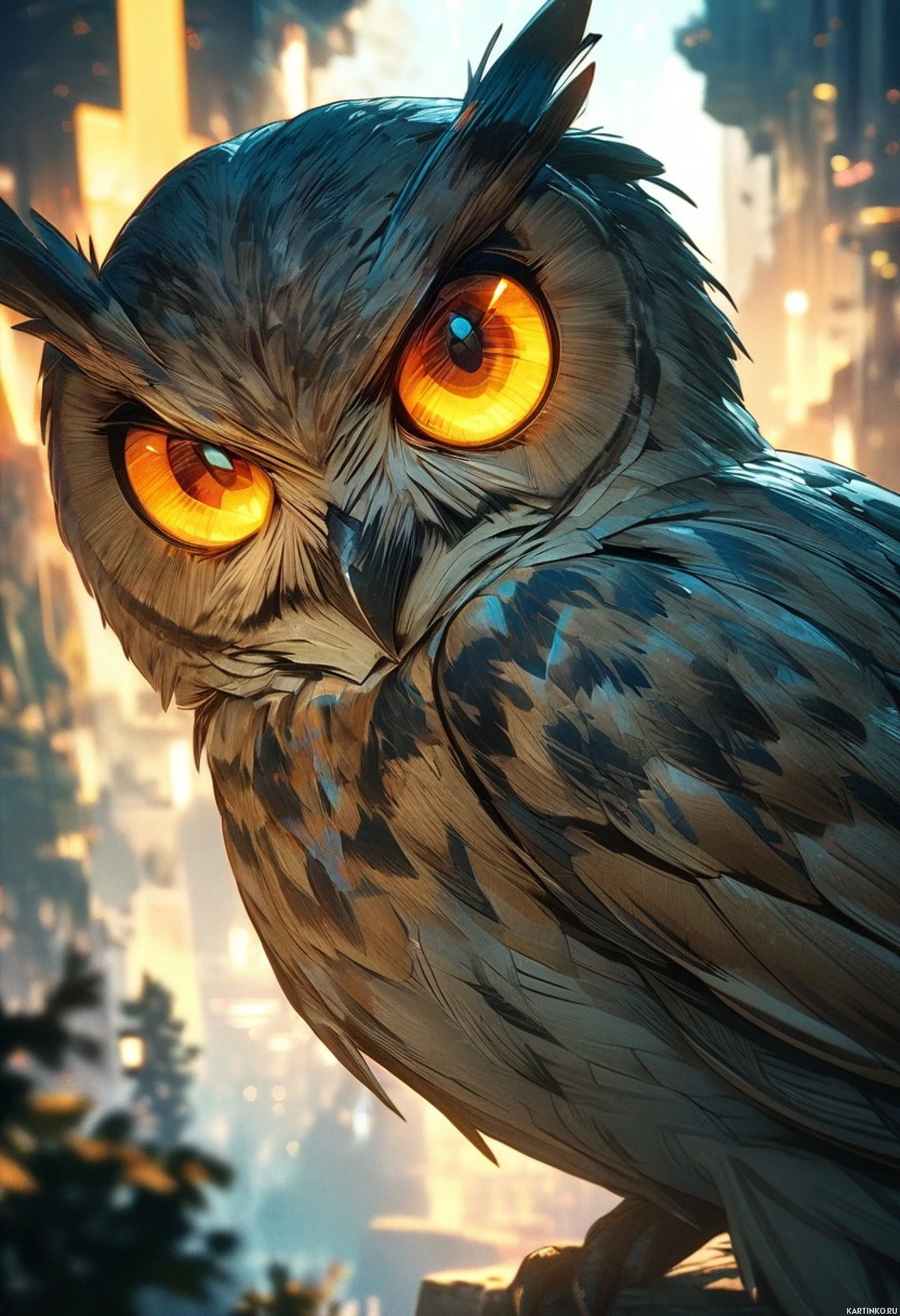 На картинке изображена величественная сова, сидящая на камне или постаменте в городском пейзаже. Сова повернута лицом вперед, с широко открытыми желтыми глазами и слегка расправленными крыльями, будто готовясь взлететь. У нее характерный коричнево-белый оперение, усеянное черными пятнышками, что типично для данного вида. На заднем плане – размытый городской пейзаж на закате или ночью, что создает ощущение ночной сцены, возможно, намекающее на связь с фэнтезийной или магической тематикой.