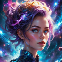 decorative purposes. Her expression is neutral with a hint of confidence. The background of the illustration features a cosmic scene, possibly representing space or another dimension, which complements her outfit and suggests she might be a character from a story set in