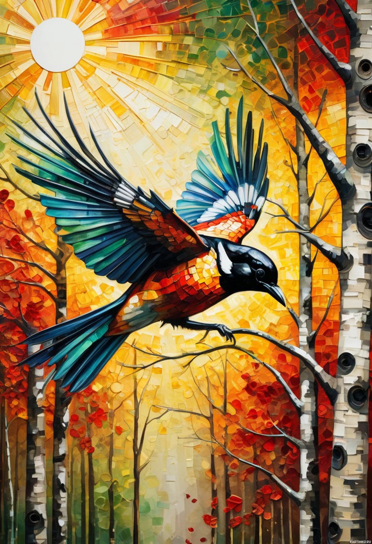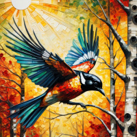 Птица в лесу на картине с изображением солнца и деревьев Больше картинок по схожим темам