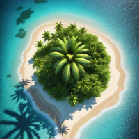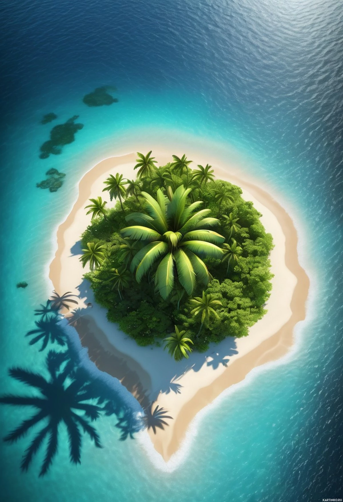На картинке изображён тропический остров, окружённый кристально чистой голубой водой. На острове растут пальмы, простираются песчаные пляжи, и он занимает центральное место в кадре. Видны подводные элементы, среди которых коралловые рифы и небольшой клочок земли слева.