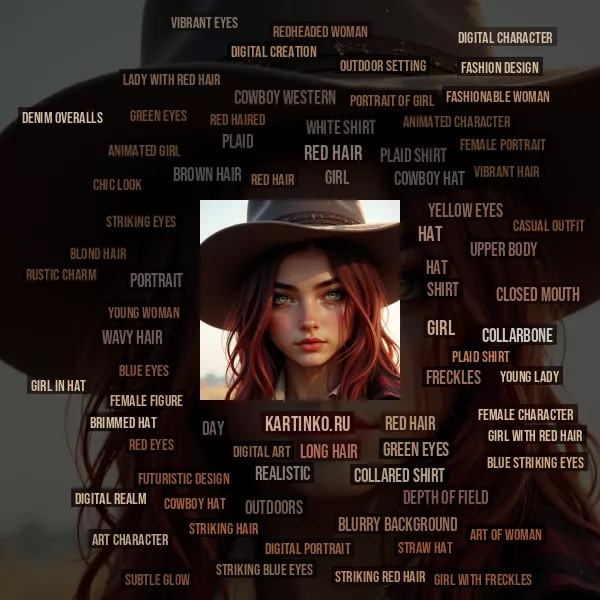 На картинке запечатлена молодая женщина с эффектными ярко-рыжими волосами, спадающими на плечи. У неё выразительные голубые глаза, и она смотрит прямо в камеру с едва уловимым выражением. Макияж её естественный, подчеркивает черты лица, не перегружая их. На ней шляпа с широкими полями, кажется, из кожи или похожего материала, что отсылает к вестерн или ковбойскому стилю. Фон нейтральный, не отвлекает от главного объекта.