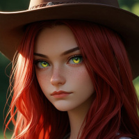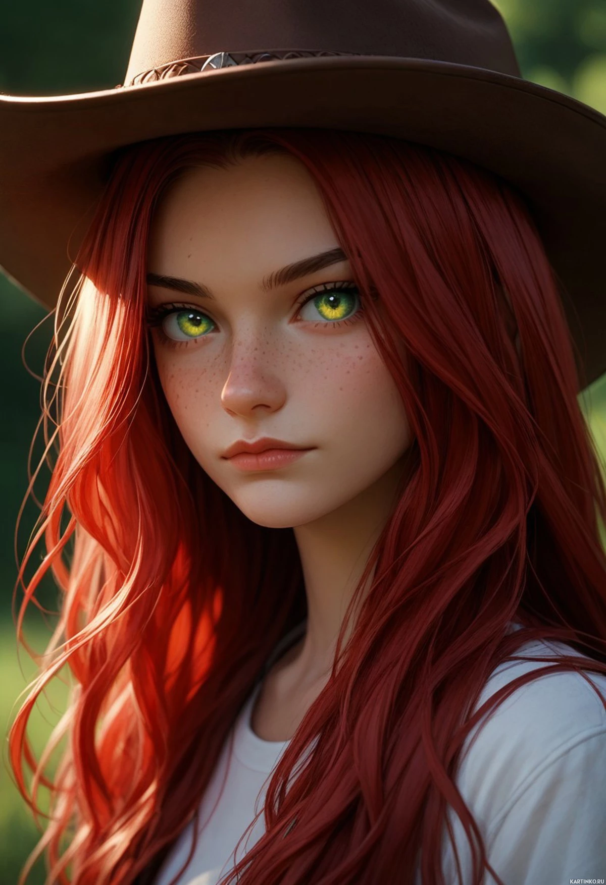 Картинка изображает девушку с ярко-рыжими волосами, в ковбойской шляпе, в стилизованном образе с преувеличенными чертами: большими глазами и длинными ресницами. Она смотрит прямо на зрителя. Картинка полна деталей и отличается тщательной проработкой теней, что придает ей реалистичность, несмотря на то, что это иллюстрация.