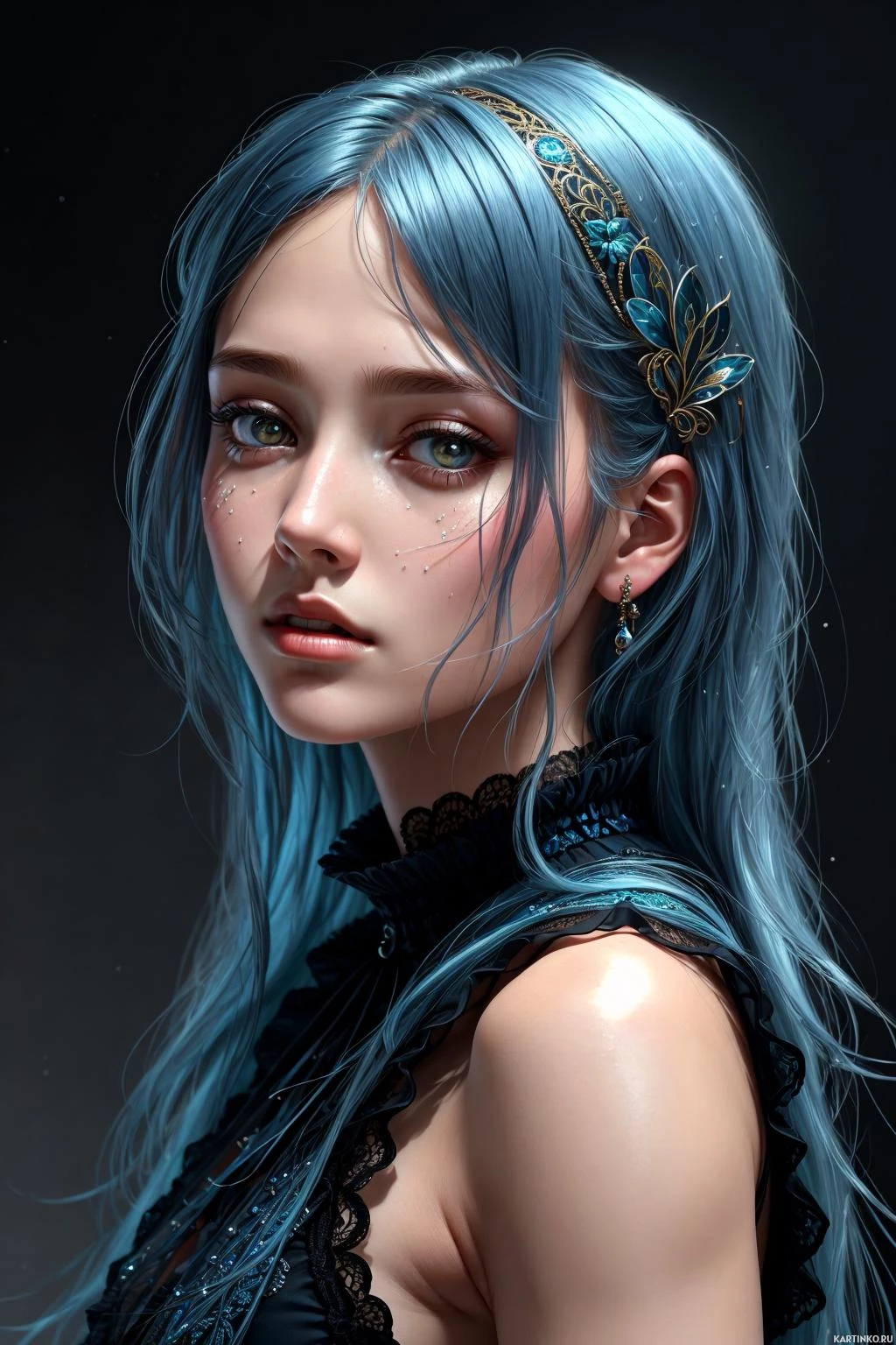 teal eyes and is adorned with a gold headpiece that resembles a tiara or crown, featuring two prominent gemstones on either side. Her makeup includes light