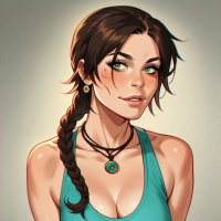 The image features a stylized, cartoon-like depiction of a female character. She has long dark hair styled in a braid and is wearing an outfit that resembles the traditional clothing associated with Lara Croft from the Tomb Raider video game franchise. The character is smiling at the viewer and appears to be posing for the portrait. The color palette of the image consists primarily of shades of blue, green, and brown, and the lighting suggests an outdoor environment with a soft, warm glow that could indicate sunlight.