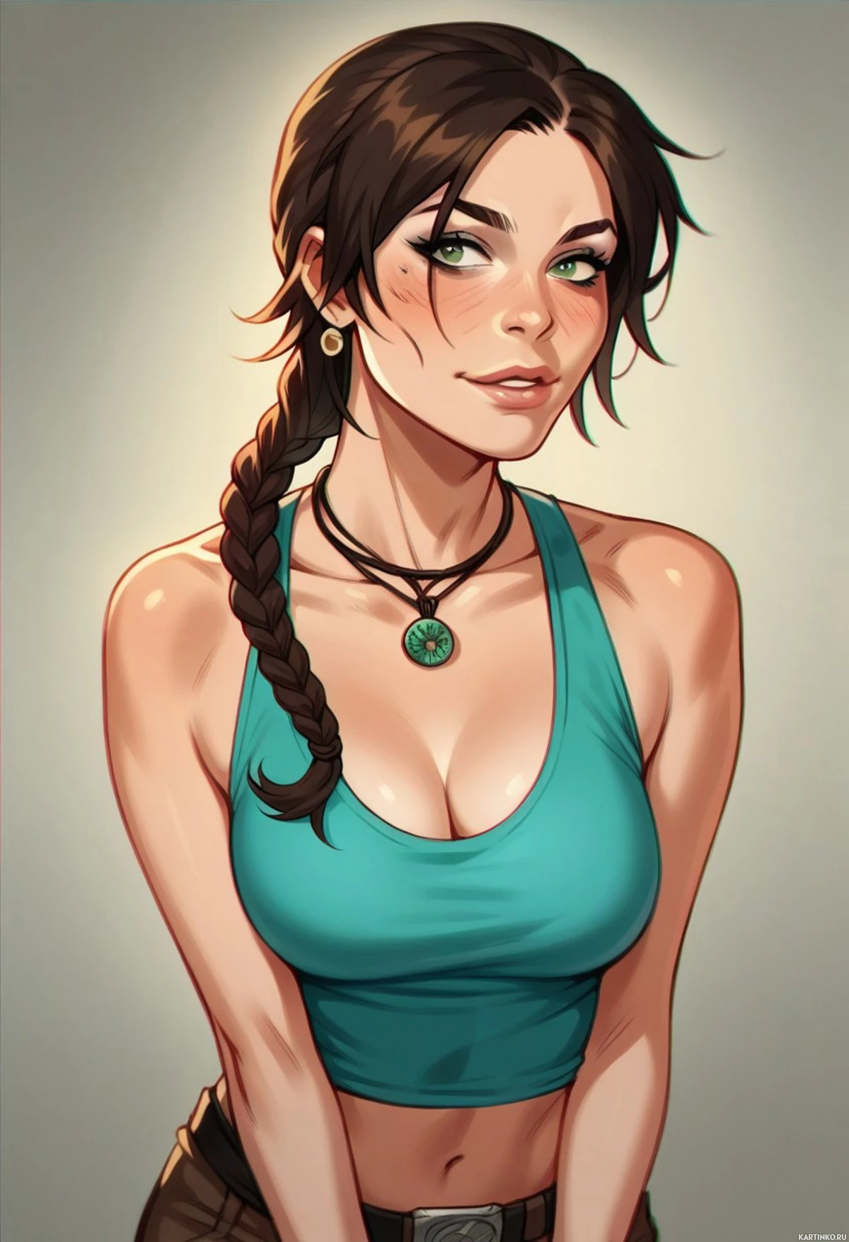 На картинке изображена стилизованный, мультяшный персонаж – девушка. У неё длинные тёмные волосы, заплетённые в косу, и на ней наряд, напоминающий традиционную одежду Лары Крофт из серии игр Tomb Raider. Девушка улыбается зрителю и выглядит так, будто позирует для портрета. Цветовая гамма картинки – преимущественно оттенки синего, зелёного и коричневого, а освещение указывает на уличное пространство с мягким, тёплым светом, похожим на солнечный.