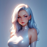The image features a stylized character with white hair. She has a sleek and modern appearance, wearing a futuristic-looking outfit that resembles a shiny leather suit. The attire is detailed, showing shadows on the clothing, which suggests a three-dimensional quality to the image. There is a noticeable glint of light reflecting off her arm, indicating that there may be a light source nearby. The character has a poised and confident pose, with one hand resting on her hip and the other near her head, where she seems to be touching or holding her hair. Her expression is neutral with a subtle hint of intensity in her gaze. The background of the image is plain and does not distract from the character.