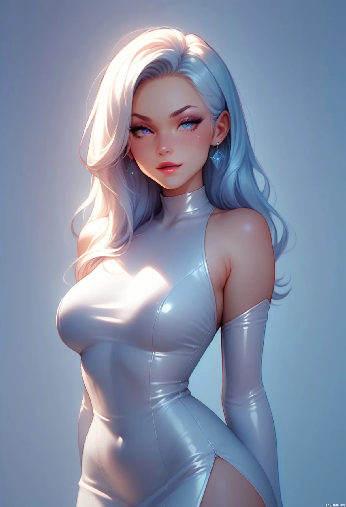 На картинке изображена стилизованный персонаж с белыми волосами. У неё современный, лаконичный облик, она одета в футуристический наряд, похожий на блестящий кожаный комбинезон. Одежда детализирована, на ткани видны тени, что придает картинке ощущение глубины. На её руке заметен отблеск света, указывающий на наличие источника освещения поблизости. Персонаж застыла в уверенной, сдержанной позе: одна рука покоится на бедре, другая – у головы, словно она трогает или задерживает пряди волос. Выражение лица нейтральное, с едва заметной напряженностью во взгляде. Фон картинки однотонный и не отвлекает внимания от персонажа.