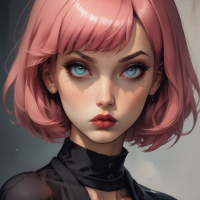 The image depicts a stylized representation of a young female character with pink hair and striking blue eyes. She has makeup that includes red lips and is wearing what appears to be black leather attire, giving her a chic and edgy look. Her expression is one of mild defiance or contemplation. The background is not fully visible but seems to suggest an indoor setting with some sort of architectural detail in the top left corner that could be part of a building's facade or decorative element.