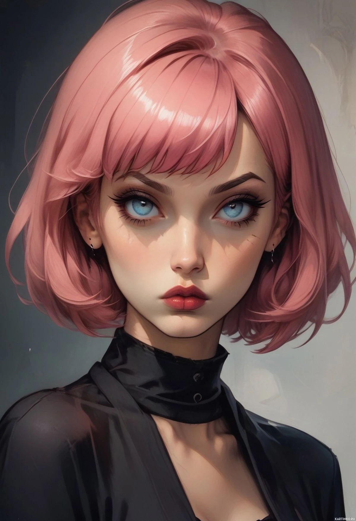 Картинка изображает стилизованное представление молодой девушки с розовыми волосами и выразительными голубыми глазами. У нее макияж с красной помадой, а на ней, кажется, черная кожаная одежда, что придает ей шикарный и дерзкий вид. Ее выражение лица — легкое непокорство или задумчивость. Фон не полностью виден, но кажется, что это помещение с каким-то архитектурным элементом в верхнем левом углу, возможно, частью фасада здания или декоративным.
