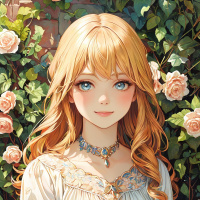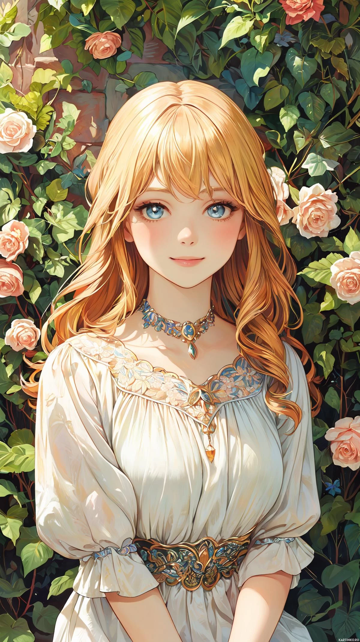 На картинке – молодая женщина, по-видимому европейской внешности. У неё длинные светлые волосы и выразительные голубые глаза. Макияж включает подводку для глаз и помаду, что придает ей утонченный вид. На ней бежевое платье с замысловатым узором на талии. Вокруг шеи – нежная жемчужное ожерелье. Она стоит на фоне пышной зелени, с частично видимой кирпичной стеной слева. Наиболее заметную деталь фона составляют розовые розы, которые оплетают кирпичную стену и окружают её.