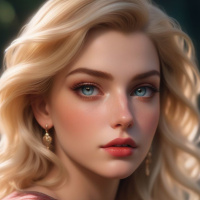 The image shows a woman with fair skin, blonde hair, and striking blue eyes. She has a neutral expression on her face and appears to be gazing slightly off to the side rather than directly at the viewer. Her complexion is smooth, and she is wearing subtle makeup that highlights her features. The lighting on her face suggests she is facing a soft light source, possibly from above or in front of her. She has rosy cheeks which might indicate a healthy blush or could be part of the artistic enhancement of the image. Her hair appears voluminous and has a slight wave to it. The woman's attire consists of what looks like a brown garment with some floral detailing at the collar area. The background is dark, with hints of space suggesting an outdoor night setting under a starry sky. The artwork has a high level of detail and suggests it may be a digital rendering rather than a photograph.