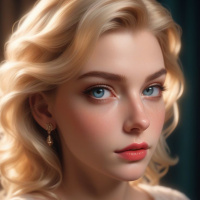 The image depicts a person with blonde hair styled in loose waves that fall over their shoulders. The individual has light skin and is wearing makeup that includes defined eyeliner, eyeshadow, mascara, and lipstick. They are looking directly at the camera with a neutral expression on their face. The lighting highlights the person's features, particularly around the eyes, which gives them an intense gaze. The background is dark and does not provide any additional context or elements.