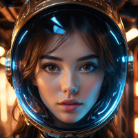 In this image, a young girl with long brown hair and blue eyes is depicted in a science fiction setting. She is wearing a gold-toned astronaut helmet that has a blue visor. Her attire includes a black suit with intricate designs, predominantly featuring metallic colors and details that suggest advanced technology or space exploration gear. The background features an industrial or futuristic design, illuminated by a reddish-orange glow from lights that are not visible in the image.