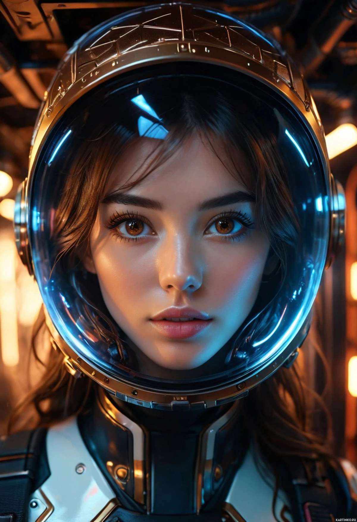 На картинке изображена юная девушка с длинными каштановыми волосами и голубыми глазами в научно-фантастическом сеттинге. На ней золотистый скафандр с голубым забралом. Её костюм – чёрный, с замысловатыми узорами, преобладающими в металлических тонах и деталями, что указывает на передовые технологии или экипировку для космических путешествий. Фон выполнен в индустриальном или футуристическом стиле, освещённый красно-оранжевым светом от невидимых в кадре источников.