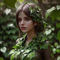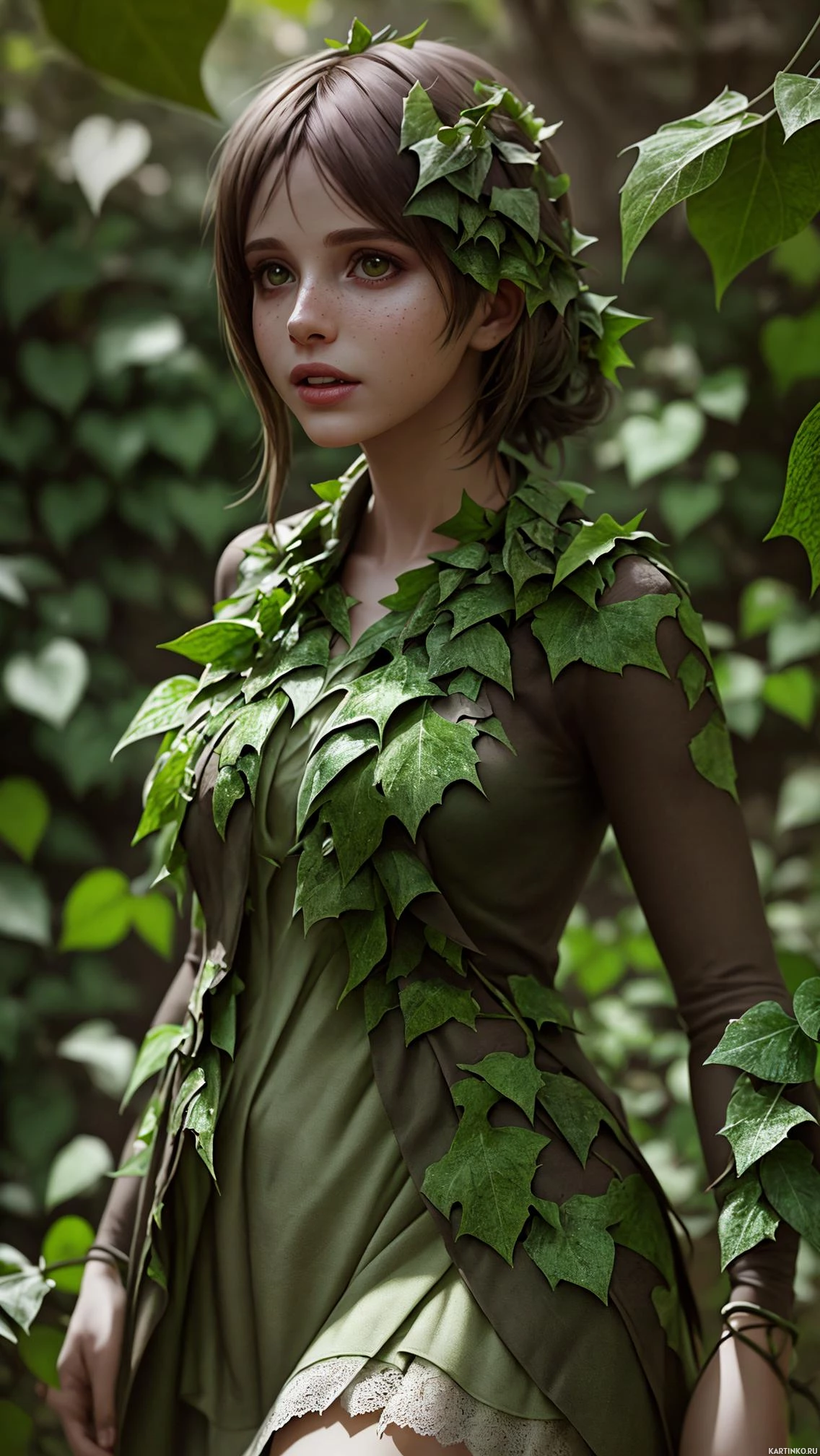 a green dress adorned with what appears to be vines or leaves. There are also green plants visible around her, possibly ivy or similar climbing plants, suggesting that the setting might be a forest or a garden with