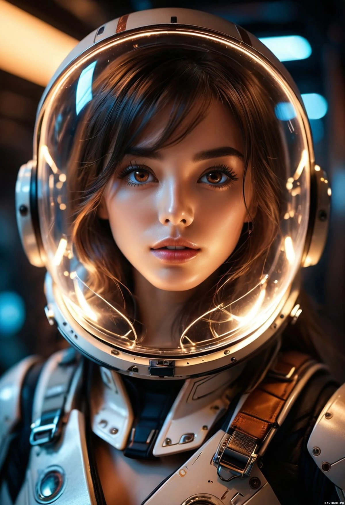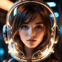 На картинке изображен персонаж, похожий на астронавта из научно-фантастического сеттинга. У нее длинные темные волосы, голубые глаза, кажущиеся светящимися, и светлая кожа. Черты лица четко очерчены: заметные ресницы, пухлые губы и нейтральное выражение лица. На ней белый шлем с черными визорами, имеющими небольшие круглые вырезы. На шлеме – металлическая конструкция, возможно, с циферблатами или элементами управления. Также на ней темный костюм с синей накладкой на груди и рукавах. Общая эстетика картинки наводит на мысль, что она могла быть создана для видеоигры или анимационного сериала, благодаря своему стилизованному виду.