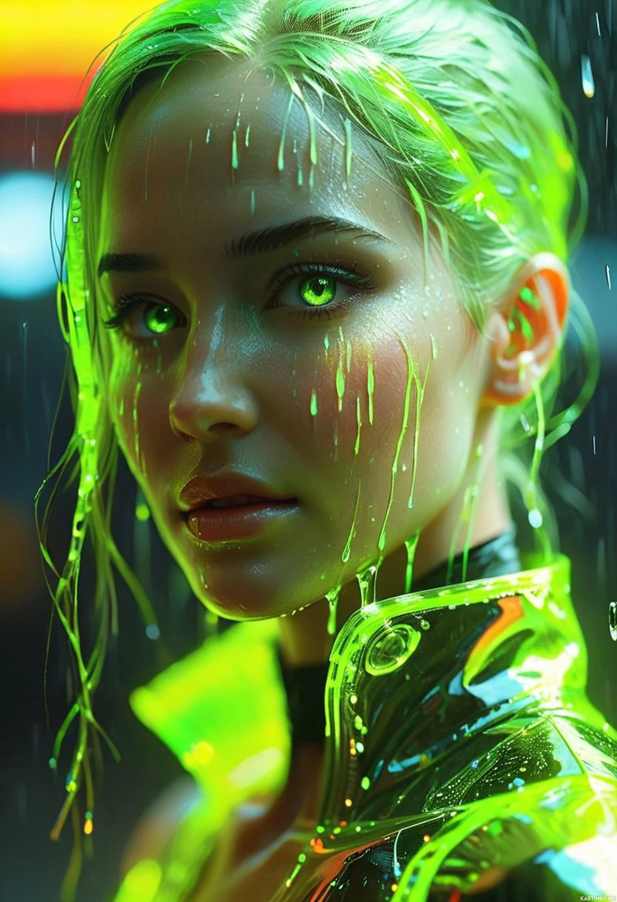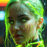 The image features a woman with green hair. She has a thoughtful expression and her gaze is directed off to the side, slightly away from the viewer. Her skin appears smooth and she has subtle makeup that includes defined eyebrows, eyeshadow, and lipstick that matches her hair color. She is wearing what appears to be a dark-colored coat or jacket with a high collar, suggesting it could be an outfit designed for protection or utility. The background is indistinct but seems to have cool tones, which complements the overall atmosphere of the image. There are also some yellow splatters on her face and hair that might represent a liquid, paint, or another substance. The style of the image is reminiscent of digital art, possibly for a character in a game, comic, or graphic novel due to the stylized appearance and the fantastical elements such as the glowing eyes and the unique hair color.