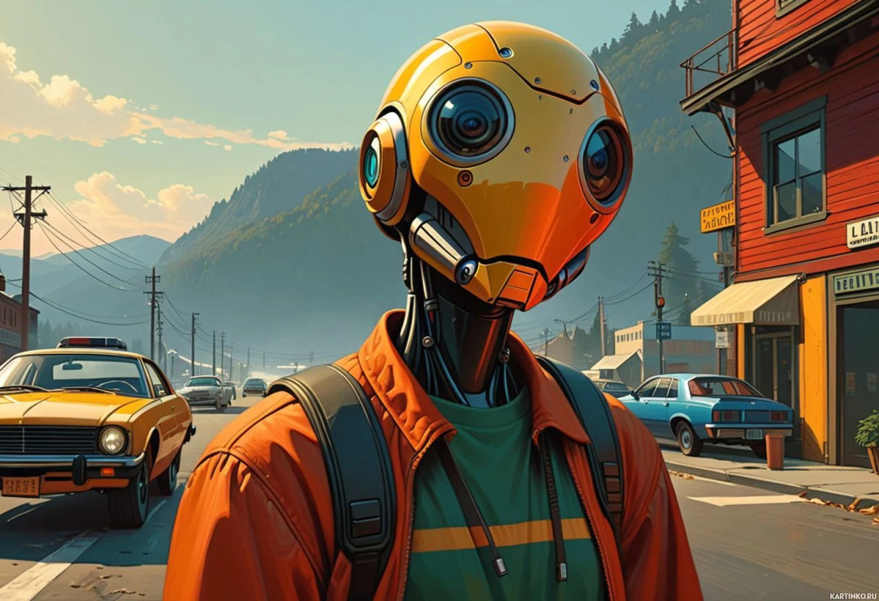 На картинке изображен персонаж, похожий на робота с человеческими чертами. У него голова жёлтого и красного цвета, возможно, обозначающая глаза или сенсоры, что характерно для научно-фантастических образов роботов. Корпус преимущественно металлический, с механическими деталями, намекающими на передовые технологии. На роботе повседневная одежда: коричневая куртка поверх зеленой футболки, рюкзак и то, что выглядит как наушники, видны на шее. Фон – городская улица со зданиями по обеим сторонам. Вдоль дороги припаркованы машины, включая грузовик и автомобиль, которые выглядят так, будто принадлежат началу XX века. Общий стиль картинки тяготеет к реализму с элементами стилизации, что может указывать на её происхождение из видеоигры или CGI-рендеринга, имитирующего фотографию.