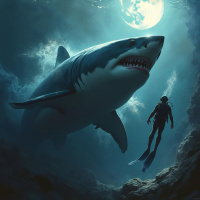 a scuba diving suit and equipment. * His face is not visible due to the angle of the camera. * The diver appears to be swimming away from the shark. * **Moon:** * The moon is visible in the top-right corner of the image. * It is full and bright, casting a silver glow over the scene. * The moon's reflection can be seen on the water's surface. * **Fish:** * There are no fish visible in the image. * However, there may be some small fish swimming near the shark or diver that are not clearly visible. * **Background:** * The background of the image is a deep blue ocean. * The water is calm, with only slight ripples visible. * The sunlight filtering through the surface creates a sense of depth and atmosphere. Overall, the image captures a tense moment between a shark and a diver in the ocean. The shark's menacing presence and the diver's attempt to escape create a sense of drama and tension.