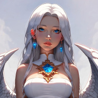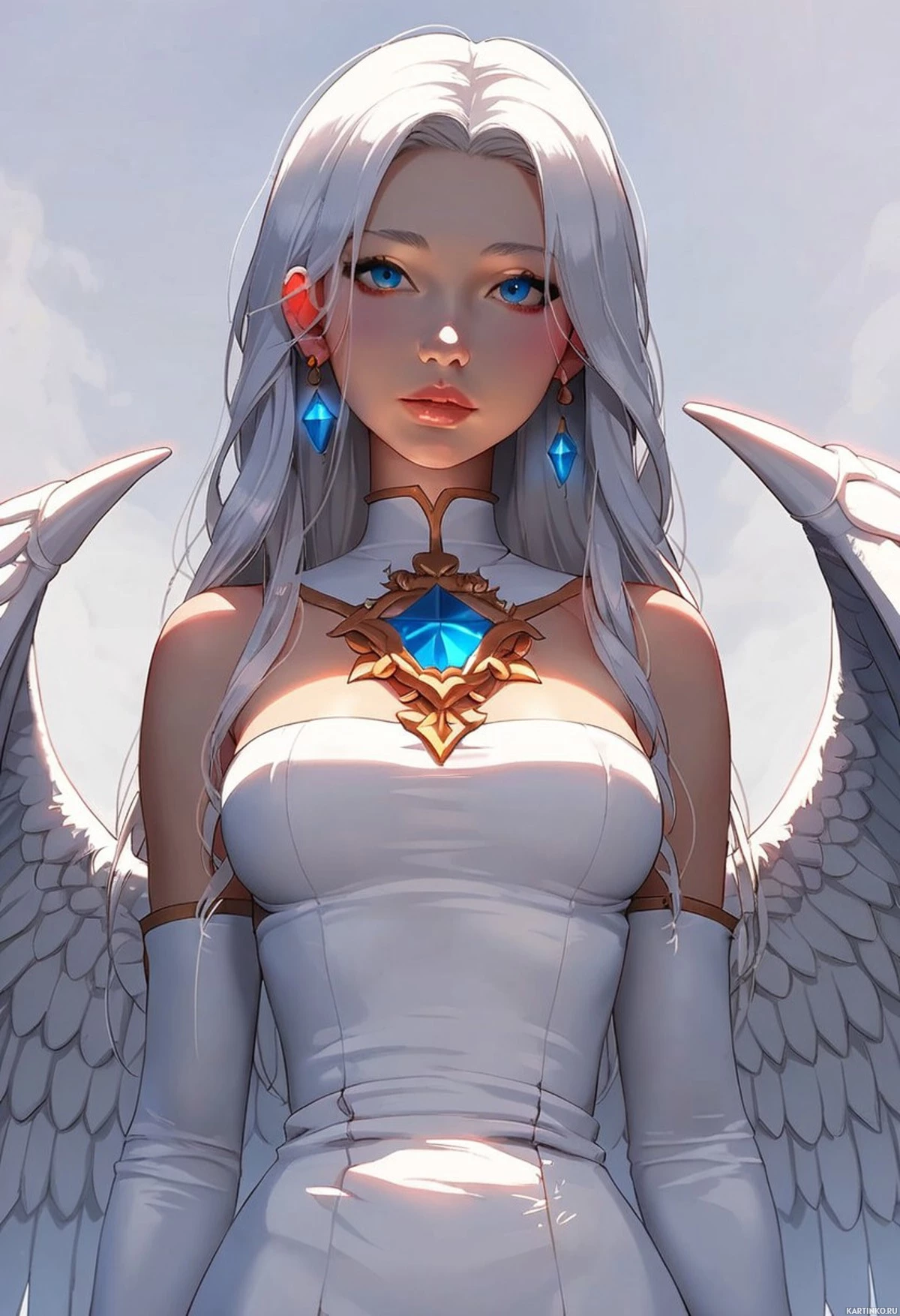 На картинке изображен стилизованный персонаж, похожий на девушку с белыми волосами и заостренными ушами, что создает ощущение ангельской или фэнтезийной тематики. У нее поразительные голубые глаза, и она одета, кажется, в доспехи – бело-золотой наряд с крыльями и драгоценным камнем на шее. На лице персонажа серьезное выражение, а фон представляет собой чистое небо с легкой дымкой облаков в верхнем левом углу.