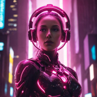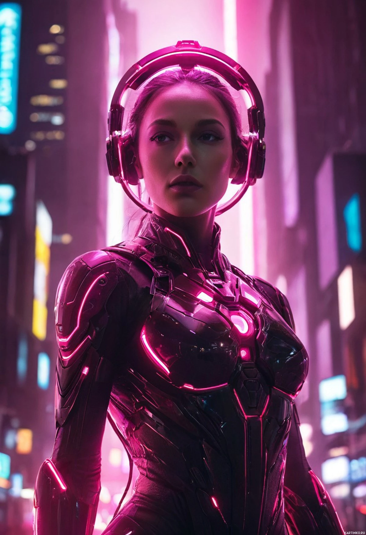 На картинке изображена женщина, стоящая в ночном городском пейзаже. На ней футуристичный доспех с розовыми акцентами и черными элементами, что отсылает к научно-фантастической тематике. В правой руке она держит некое устройство, похожее на гарнитуру или коммуникатор. У нее короткие, прямые, розовые волосы, которые ярко контрастируют с цветом кожи. Женщина смотрит прямо в камеру с нейтральным выражением лица. На заднем плане видны подсвеченные вывески и огни зданий, что указывает на городскую обстановку.