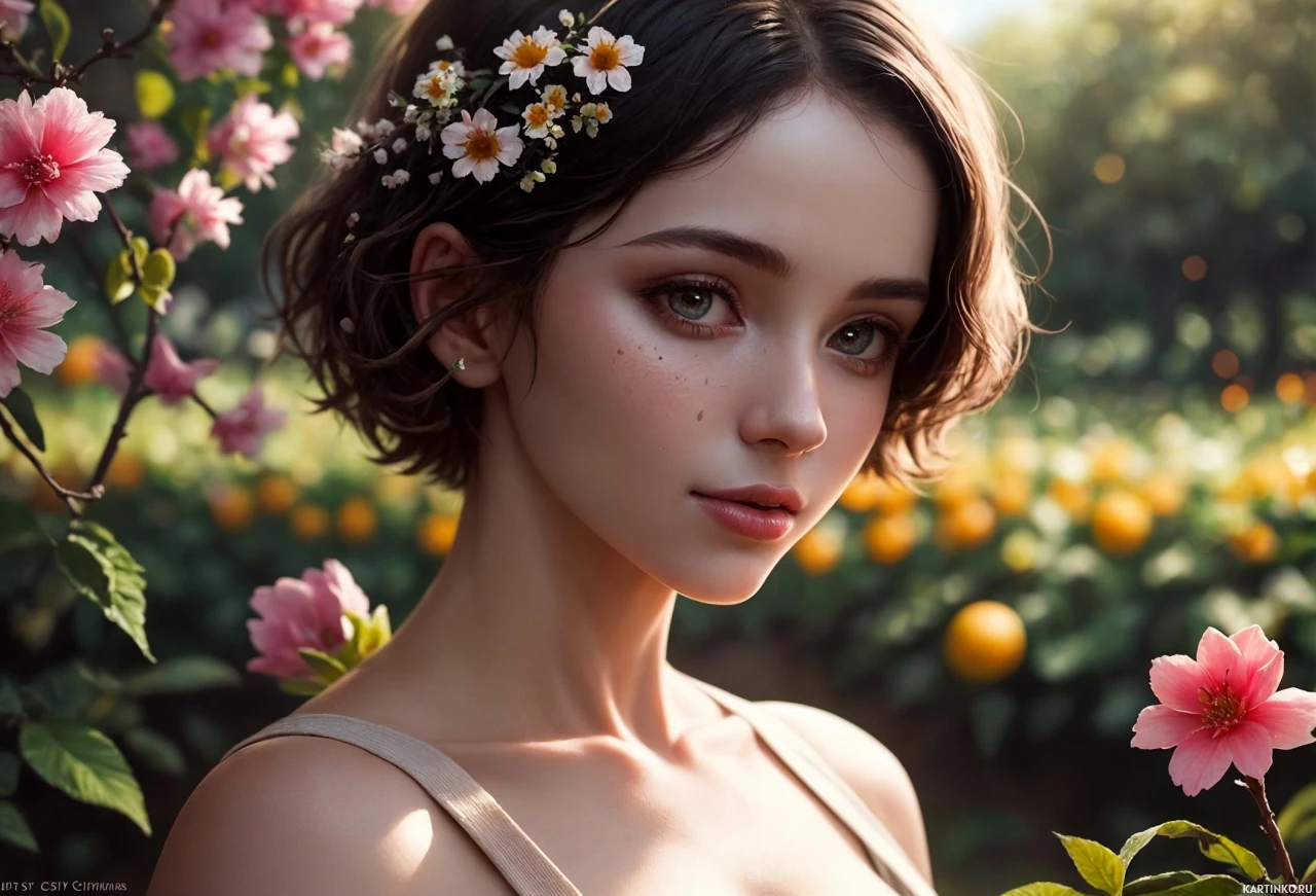 pink flowers, adding a touch of color and charm to the composition. The background includes lush green foliage and what appears to be an orchard or garden, suggesting that this might be a setting from a fantasy or a romantic scene in