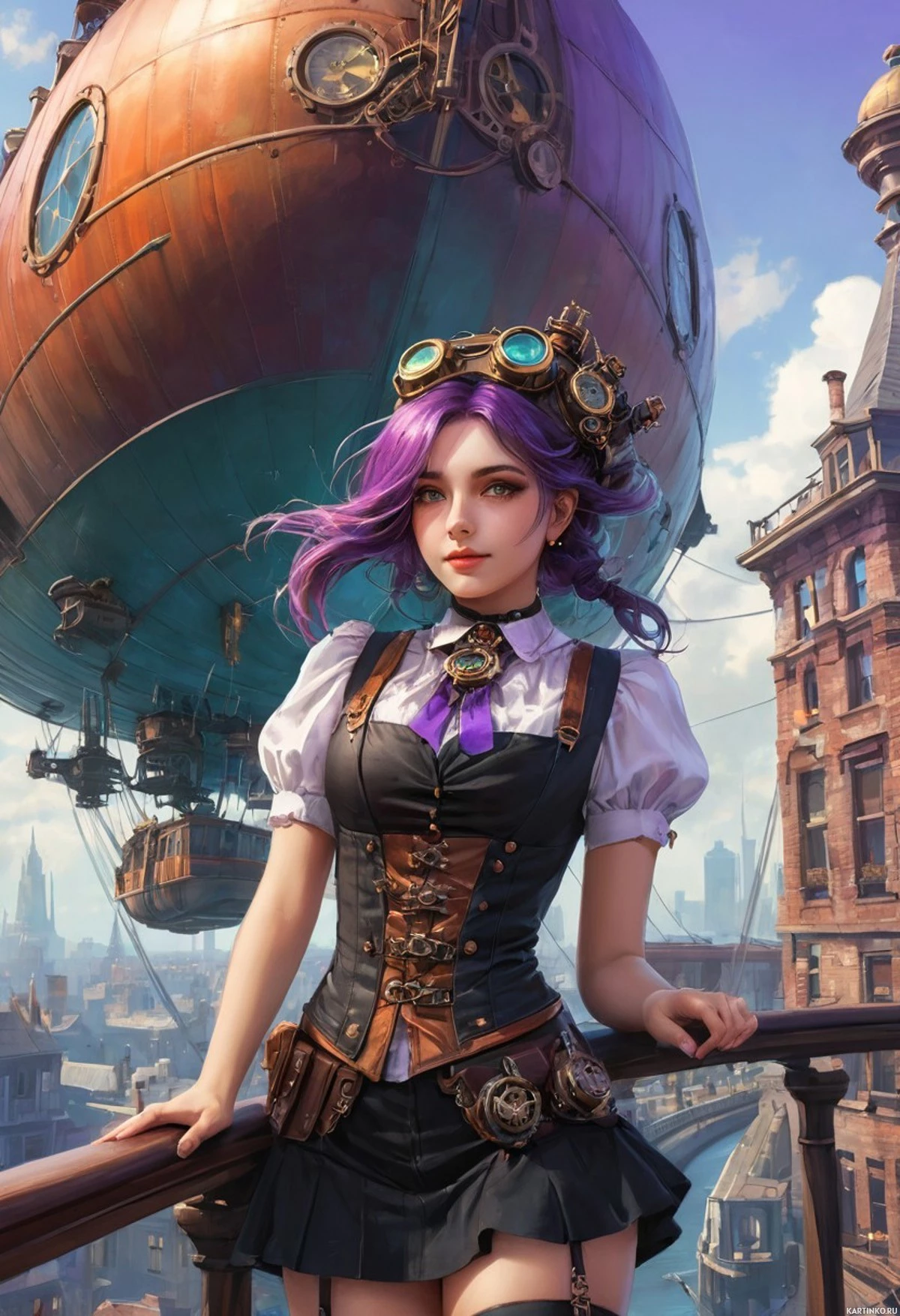 На картинке девушка с фиолетовыми волосами стоит на балконе, откуда открывается вид на старинный город. На ней костюм, включающий корсет и юбку, украшенную золотыми деталями. За её спиной в небе над городскими зданиями парят три воздушных шара. Архитектура зданий навевает мысли о стиле стимпанк или индустриальном направлении.