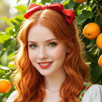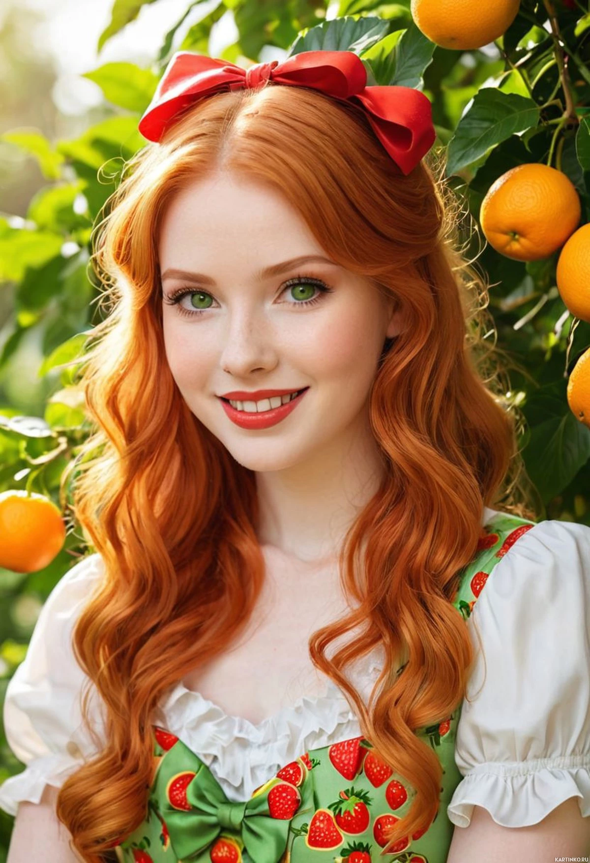 На картинке изображена девушка с рыжими волосами, уложенными волнами, в зеленом фартуке с клубничным узором. Она улыбается в камеру и у неё в волосах бант. На заднем плане – композиция из апельсинов.