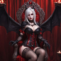 Картинка изображает фантастический сеттинг с фигурой, восседающей на богато украшенном троне с красным бархатом и золотыми акцентами, который окружен темно-красными занавесями. У фигуры белые волосы и костюм, сочетающий в себе черты суккуба и, судя по всему, демонические или ангельские крылья. На ней корсет с кружевными деталями, черные трусы с красными вставками и темные чулки с высокими каблуками. На голове видны рога, а также декоративные аксессуары, напоминающие перья. Общая цветовая палитра — сочетание темно-красных и металлических тонов, создающее ощущение роскоши и величия.