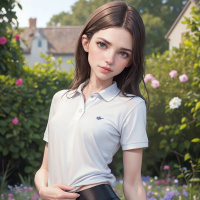 In the image, there is a woman standing outdoors during the day. She has long brown hair and is looking directly at the camera with a neutral expression on her face. The woman is wearing a collared shirt that appears to be light in color with a darker panel near the waist, possibly indicating some sort of belt or fashion detail. Her pants are black leather, which contrasts with the lighter colors around her. The background features a garden area with well-maintained plants and flowers, as well as some buildings that could be part of a residential complex. The lighting suggests it is daytime, likely late afternoon or early evening given the soft shadows cast on the ground.