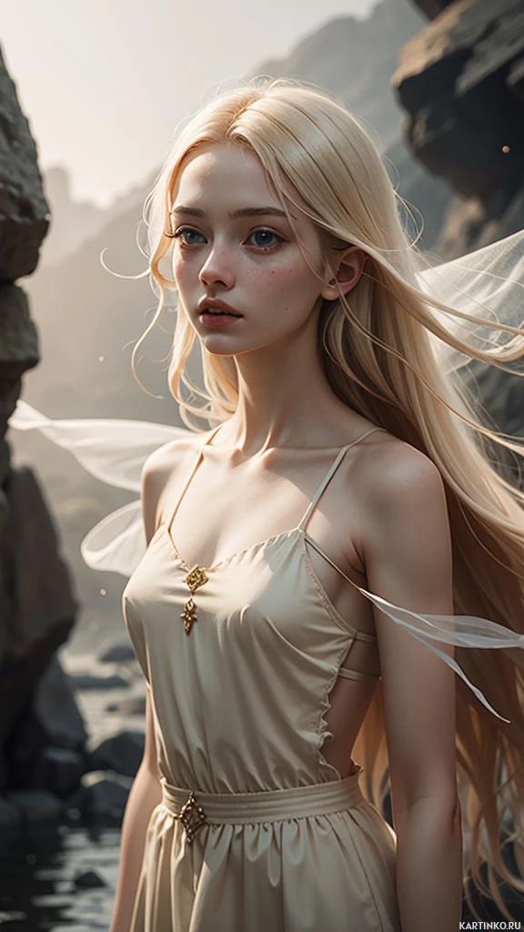 an outdoor setting with rocky cliffs, which contributes to the overall fantasy theme of the image.