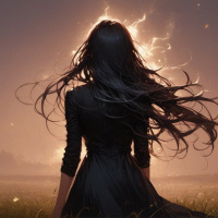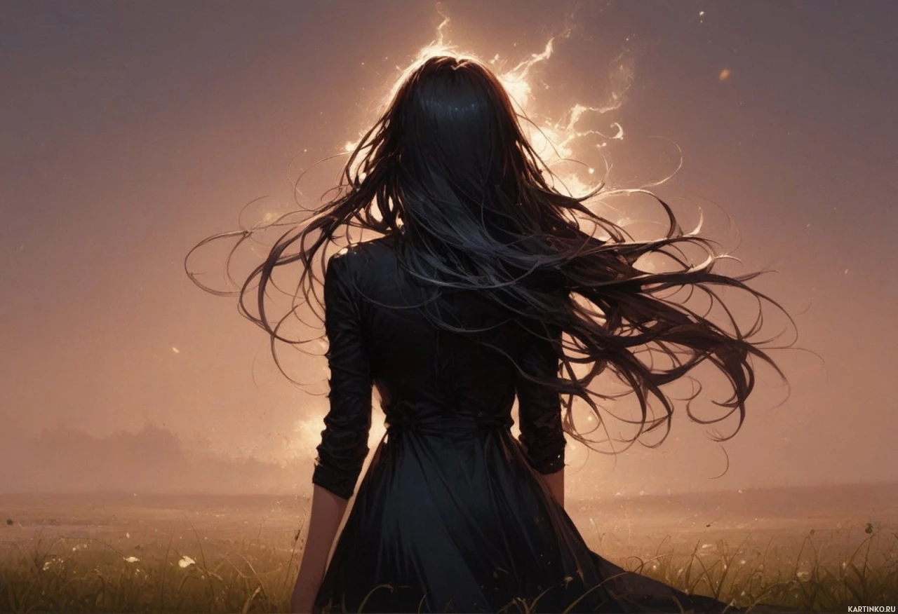 На картинке изображена женщина с длинными волосами, стоящая на фоне драматичного пейзажа, напоминающего апокалиптическую или сверхъестественную сцену. У неё тёмные, волнистые волосы, ниспадающие на плечи и спину. Она одета в чёрное, струящееся платье, которое словно сливается с окружающей тьмой, придавая ей неземной вид. На заднем плане – ночное небо, освещенное вспышками молний, создающими ощущение бури и хаоса. Внизу – луг, где горят небольшие костры, добавляющие зловещую атмосферу. Стиль картинки намекает на то, что она могла быть создана для видеоигры, фильма или анимационного сериала, благодаря кинематографичности и детальной проработке одежды персонажа и окружающего пространства.