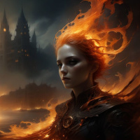 Девушка с огненно-рыжими волосами. На ней темный наряд с пламенным узором, а на лице – серьезное выражение. На заднем плане виден замок на закате под лунным небом. Место действия похоже на фантастический мир.