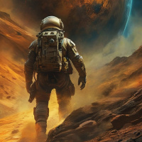 На картинке виден сзади астронавт, идущий по безжизненному марсианскому пейзажу. На нём скафандр с рюкзаком, что говорит о его готовности к исследованиям или космическим путешествиям. Над ним – большая планета, похожая на Марс, с отчетливыми красными и синими участками, что намекает на наличие воды или растительности на этом внеземном теле. Небо переходит из тёмных к светлым оттенкам, в правом верхнем углу видны далёкие звёзды, создавая научно-фантастическую атмосферу.