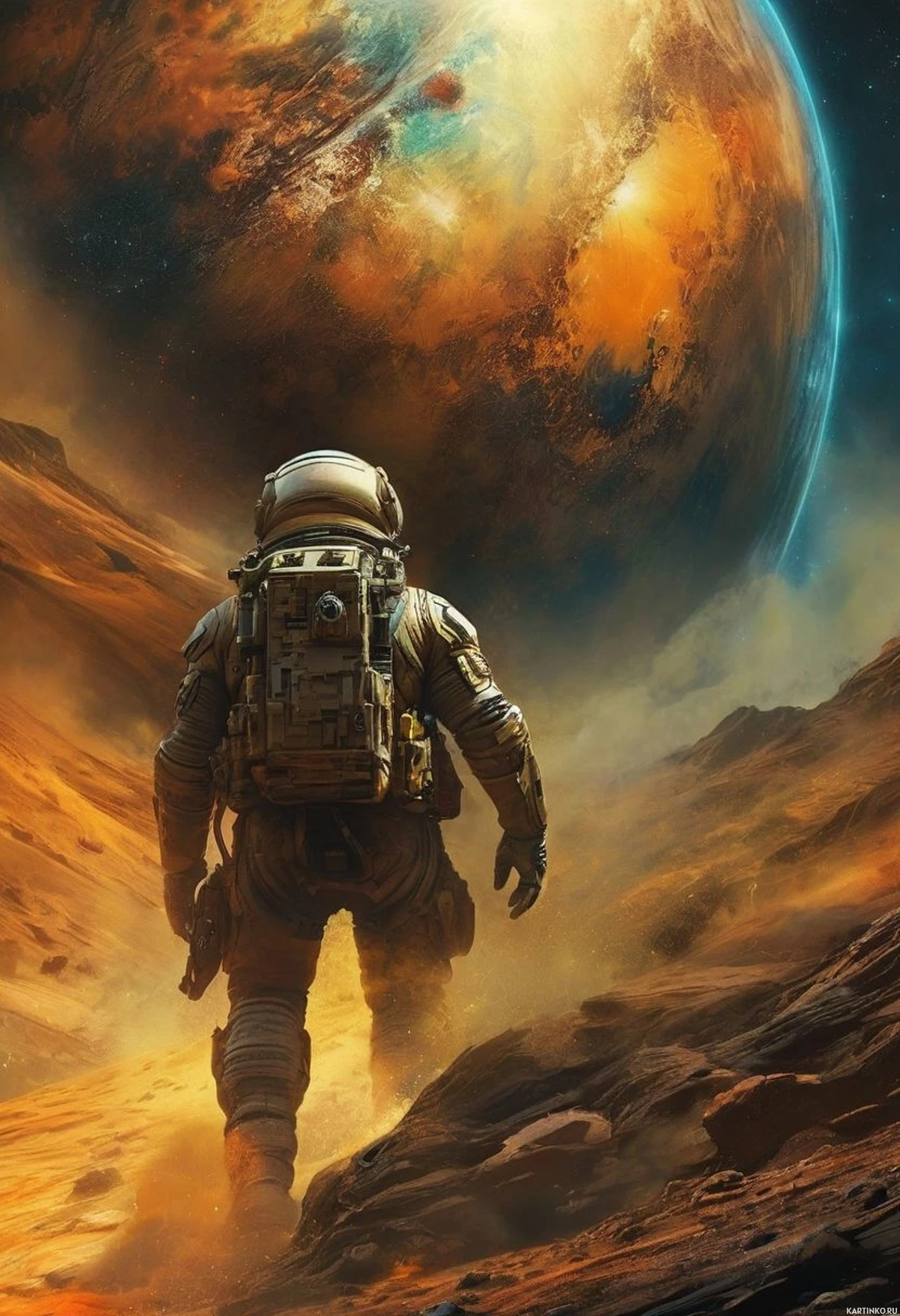 In the image, an astronaut from behind is seen walking on a desolate Martian landscape. The astronaut is wearing a suit with a backpack, indicating that they are prepared for exploration or space travel. Above them, there's a large planet resembling Mars with distinct red and blue patches of landform, suggesting the presence of water or vegetation on this otherworldly body. The sky is a gradient of dark to light shades, with distant stars visible in the upper right corner, adding to the science fiction atmosphere of the scene.