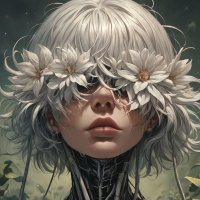 На картинке изображена девушка с белыми волосами, украшенными ромашками. У неё тёмные глаза и закрытые веки, что придаёт ей спокойное и задумчивое выражение. Её одежда выглядит как сложный механический или кибернетический дизайн, что наводит на мысль о персонаже из истории, действие которой разворачивается в футуристическом или сказочном мире. Фон – градиент тёмных оттенков, возможно, изображающий ночное небо или подземное пространство.
