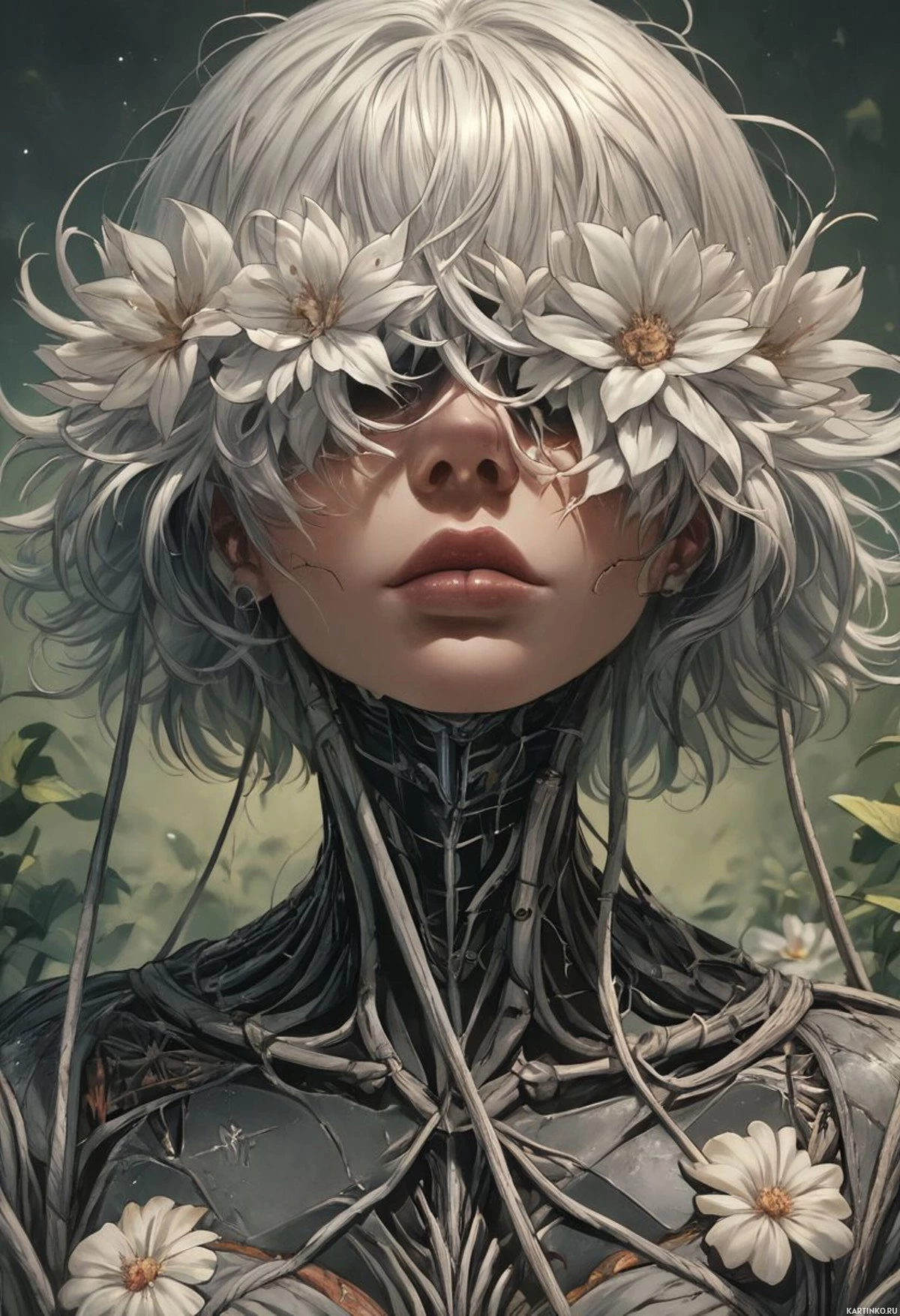 The image features a girl with white hair adorned with daisies. She has dark eyes and closed eyes, giving her a serene and contemplative expression. Her attire appears to be an intricate mechanical or cybernetic design, suggesting she could be a character from a story set in a futuristic or fantasy world. The background is a gradient of dark hues, possibly indicating a night sky or underground setting.