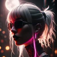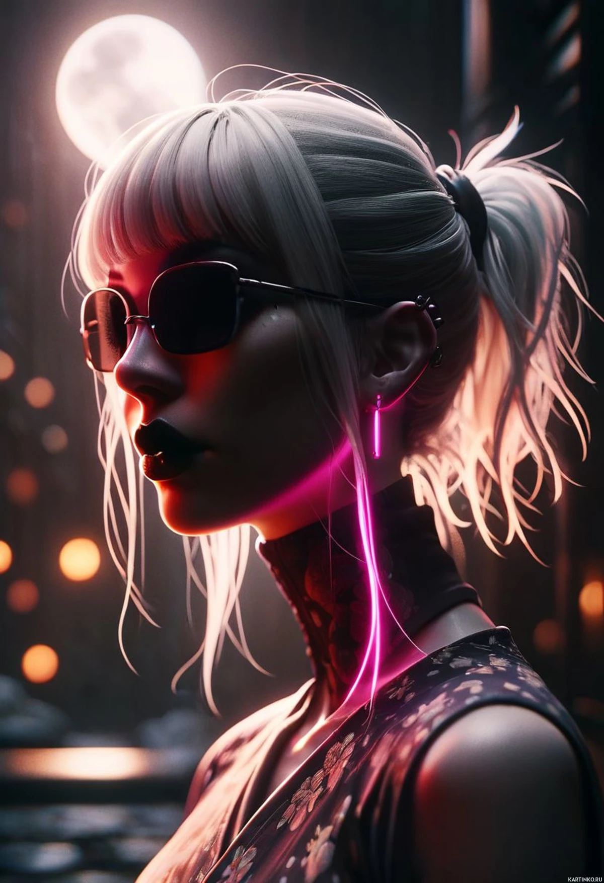 На картинке — трехмерная фигура девушки с белыми волосами, уложенными набок, в розовых серьгах и облегающем топе с цветочным принтом. На голове у нее солнцезащитные очки. Она смотрит в сторону с серьезным выражением лица. На заднем плане видна городская ночная панорама с неоновыми огнями.
